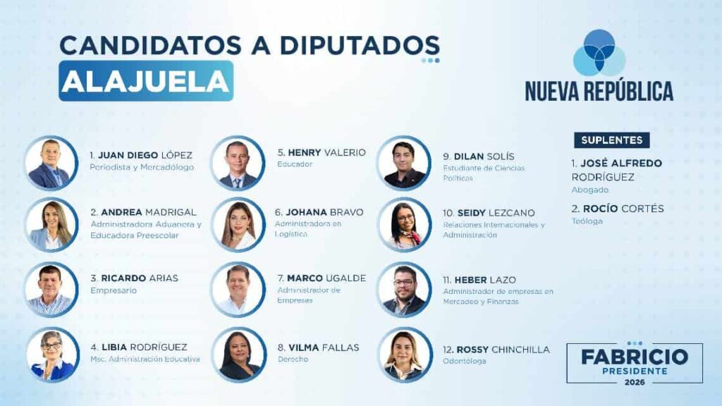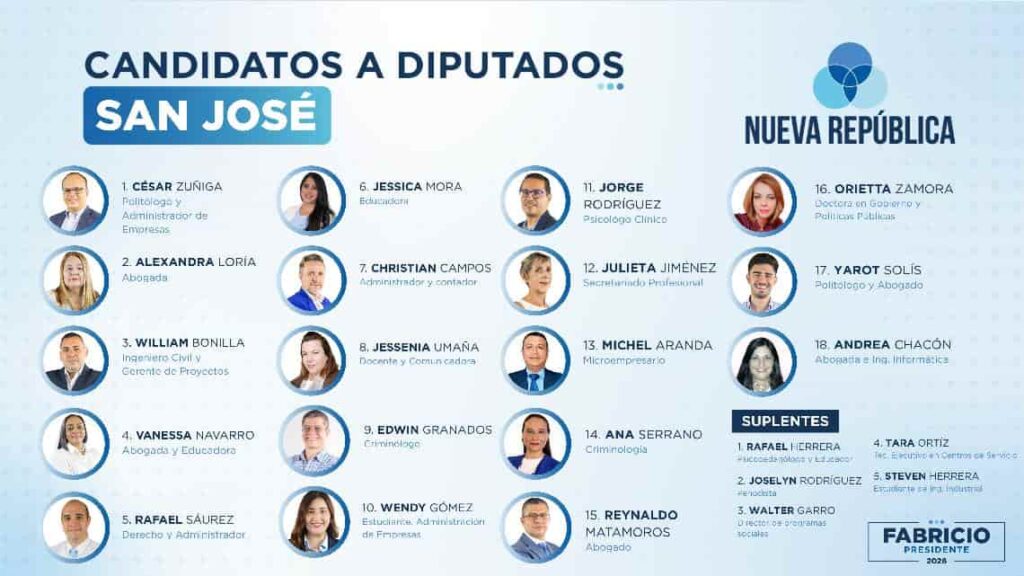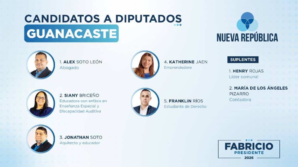 El partido Nueva República ha anunciado los perfiles de los candidatos a diputados que conformarán su próxima fracción legislativa. Liderada por Fabricio Alvarado, la agrupación política busca consolidar un bloque que, según sus líderes, representa los valores de “la vida, la familia y la soberanía”. La lista de aspirantes está compuesta por una variedad de profesionales de distintas áreas, con el objetivo de abordar los retos del país desde una perspectiva técnica y con principios conservadores.
