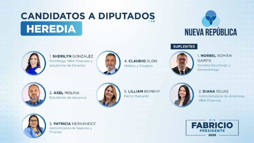 - Heredia: La lista de esta provincia es liderada por Sherilyn González, politóloga y especialista en finanzas. La acompañan un estudiante de docencia, una administradora de negocios y un médico cirujano.
