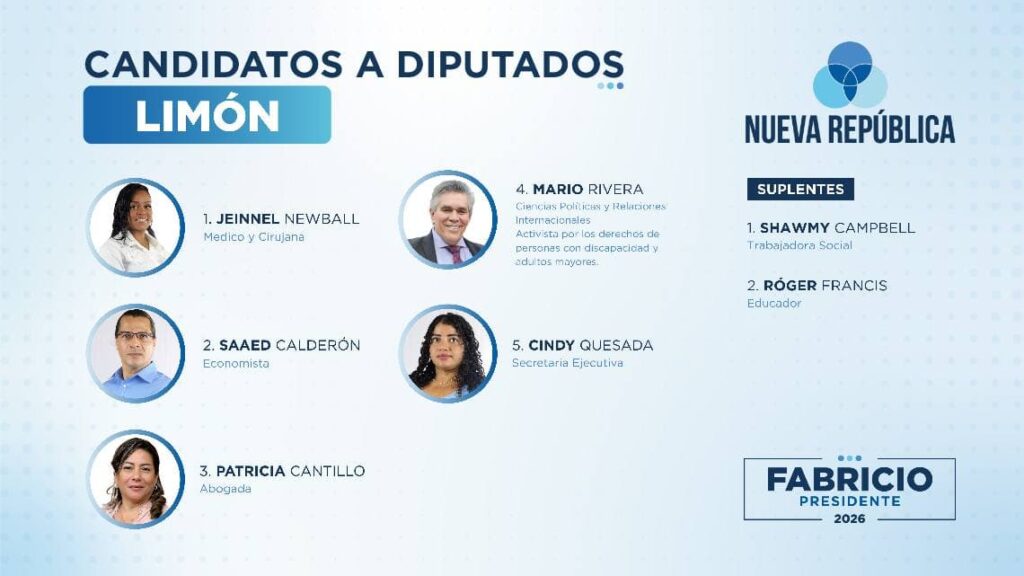 - Limón: La provincia caribeña tiene a Jeinnel Newball, médico cirujano, como cabeza de lista. Le siguen un economista, una abogada y un politólogo.