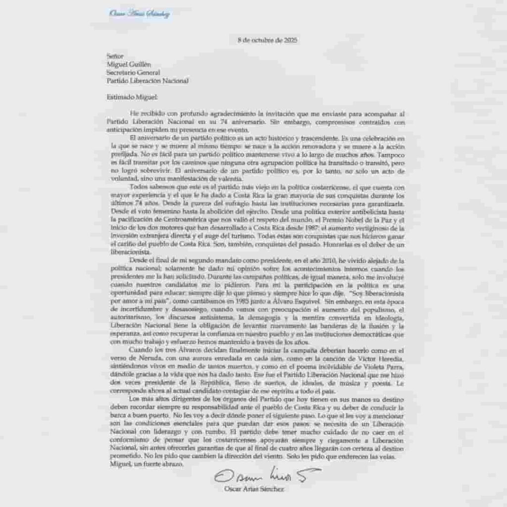 Óscar Arias Sánchez, confirmó que no asistirá a la celebración del 74 aniversario del Partido Liberación Nacional (PLN). Aprovechó su carta de respuesta para reflexionar sobre las conquistas históricas del partido y el futuro de su liderazgo.