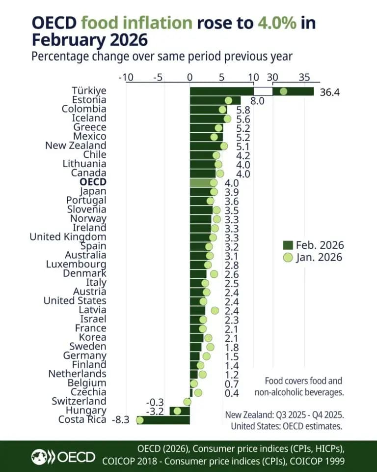 Los precios de los alimentos cayeron un 8,3% en febrero de 2026, comparado con el mismo mes del año anterior. No es un ajuste leve. Es la caída más fuerte dentro de los países de la OCDE.