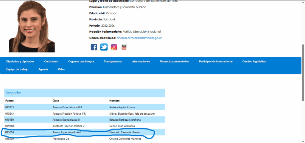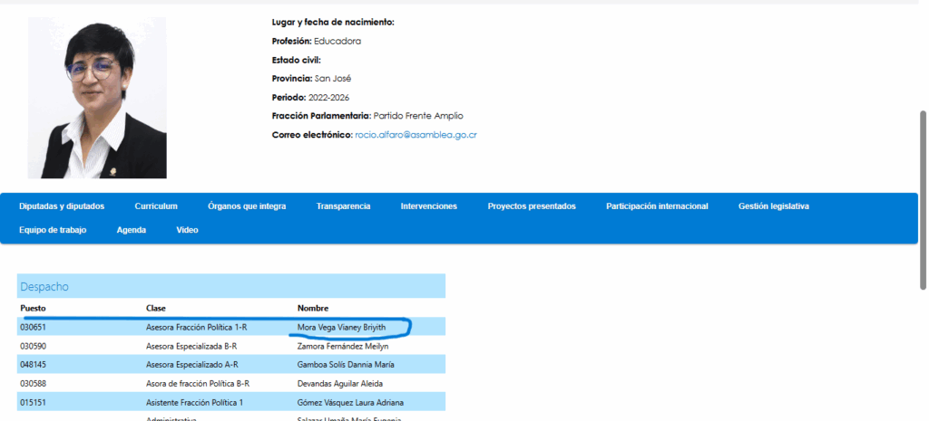 Por su parte, la asesora de la diputada Rocío Alfaro, Vianey Mora Vega, también ha sido objeto de escrutinio. Mora, quien labora para la jefa de fracción del FA, fue candidata a la alcaldía de Desamparados en las elecciones municipales de 2024 y recientemente ganó una candidatura a diputada en la convención interna del partido.