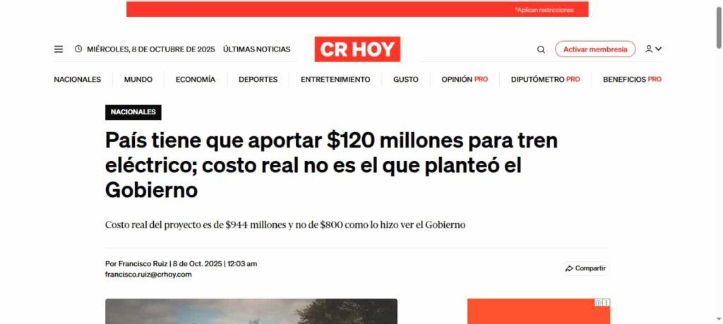 El medio crhoy lanzó hoy una alarma pública, alegando que el proyecto de tren actual tiene un costo “real” de $944 millones y que el país deberá aportar $120.5 millones para cubrir tierras y comisiones.